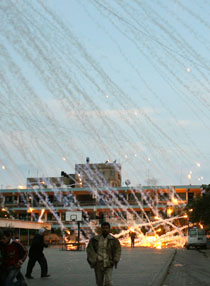 Palestinian civilians run to safety during an Israeli strike over a UN school in Beit Lahia, northern Gaza Strip early on January 17, 2009. A woman and a child were killed early today in the Israeli strike on the UN-run school in northern Gaza where civilians were sheltering from the fighting, medics and witnesses said. Fierce clashes were underway around the school as Israeli tanks exchanged fire with Palestinian militants, they said. AFP PHOTO / MOHAMMED ABED