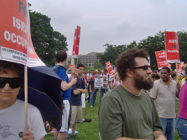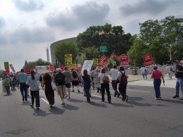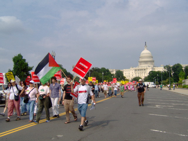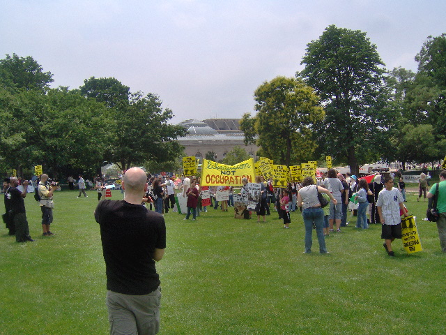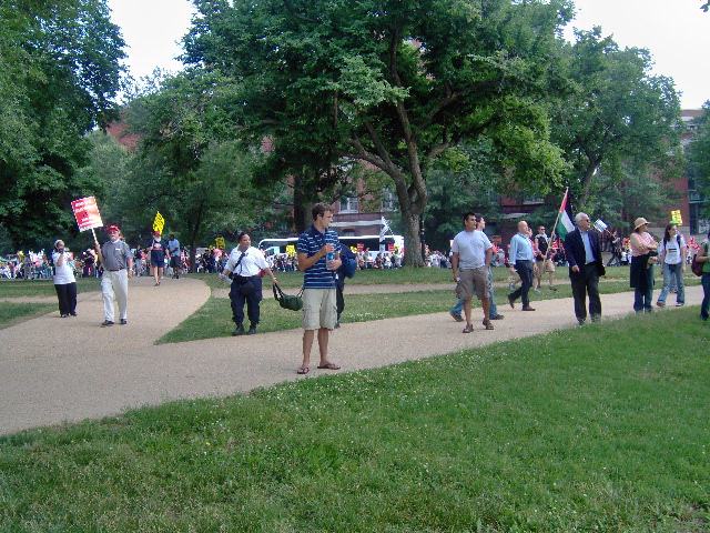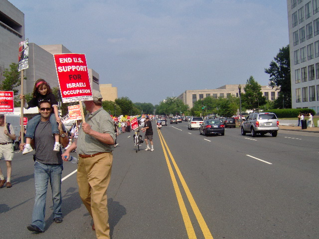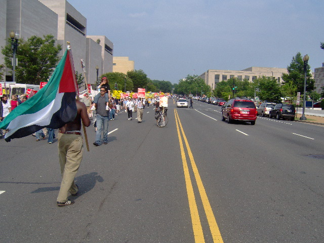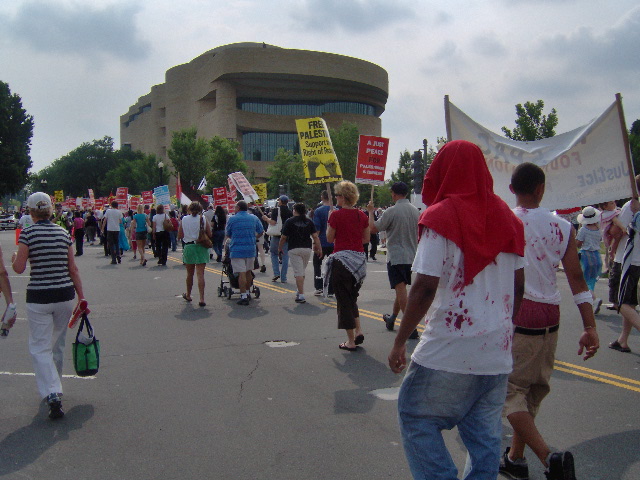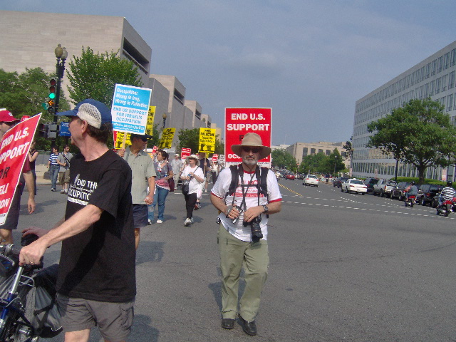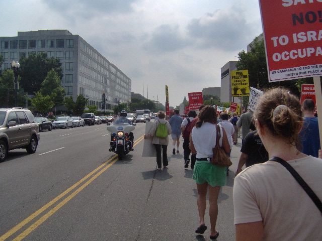 Here are some of my photos from the 10 June March on Washington, D.C. to End the Israeli Occupation. I rarely ever take pictures so the quality is not good. And I was warned to stay behind the yellow lines by the motorcycle cop pictured here so angles on the length of the march were fewer than I’d hoped to get; from the Capitol to the Ellipse the streets were filled with protesters.